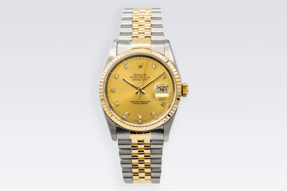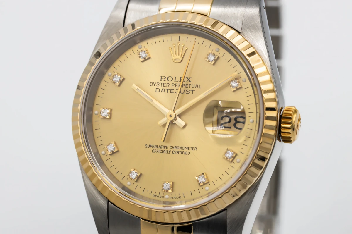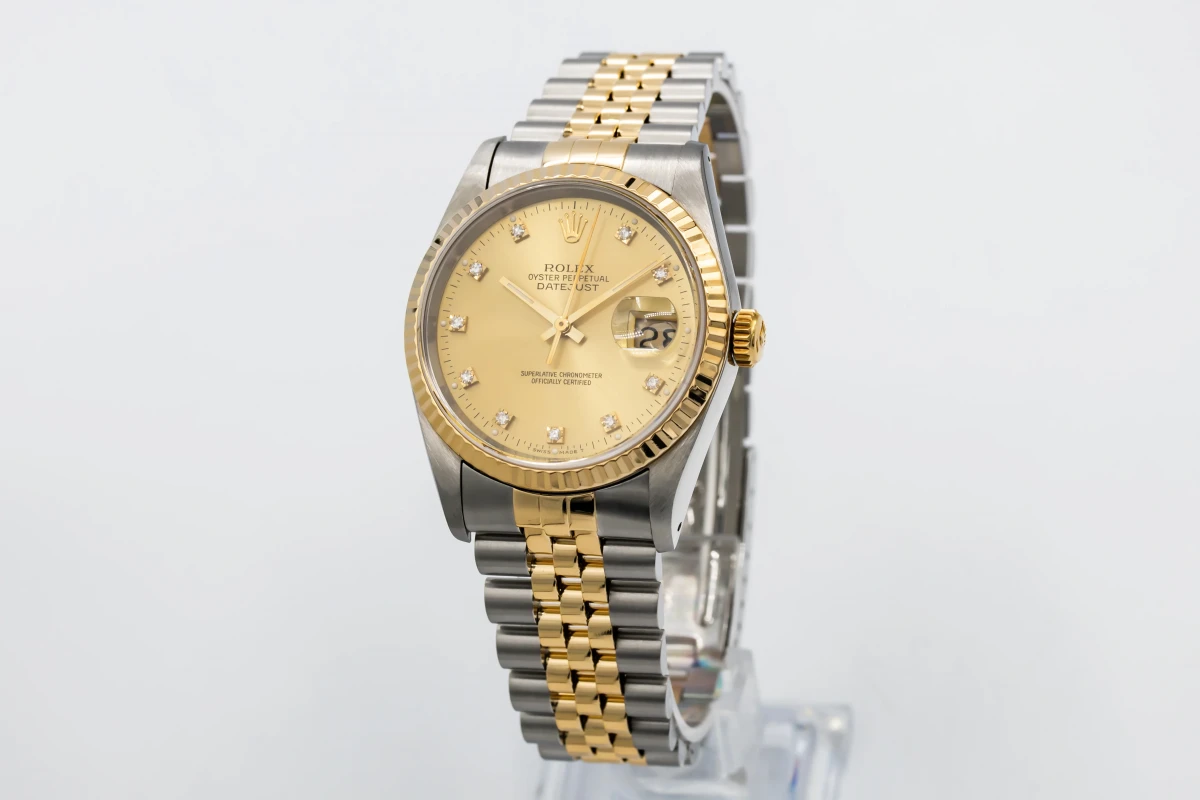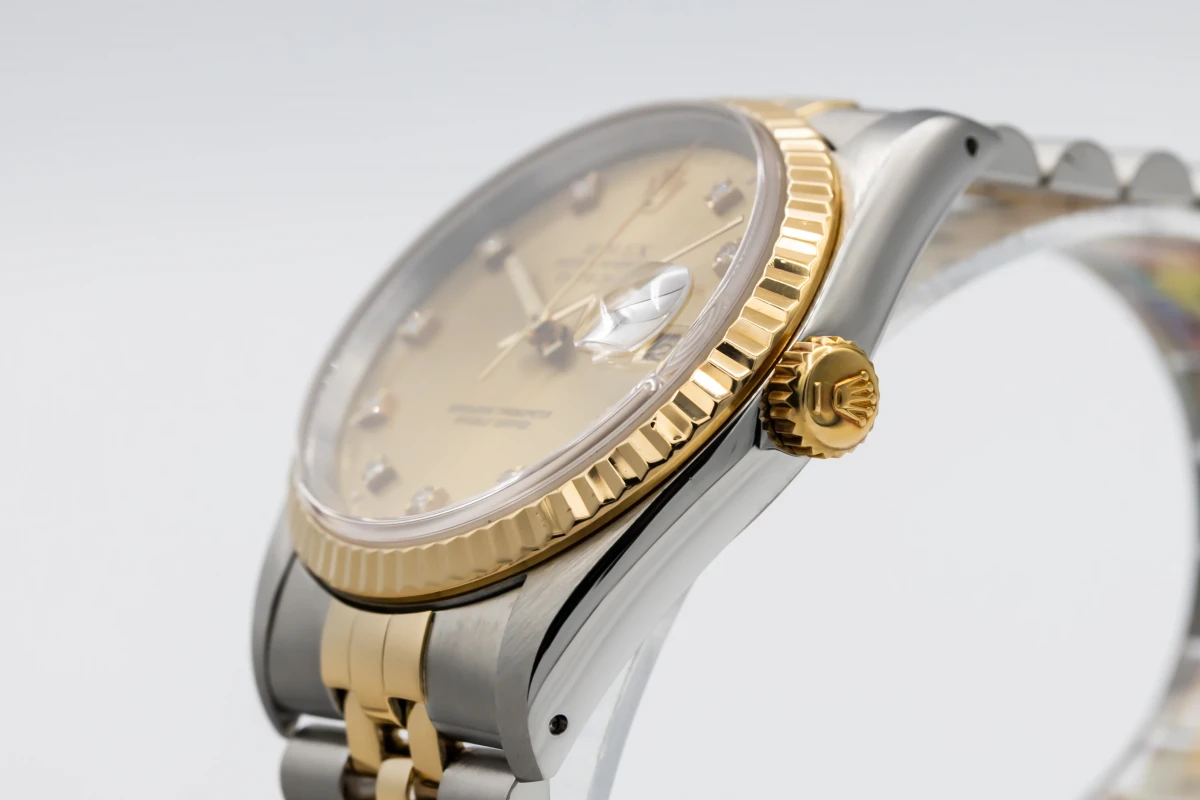 This 1991 Rolex DateJust 36mm features a champage dial with factory diamond markers and a stainless steel and 18ct yellow gold jubilee bracelet. It also features a 18ct yellow gold fluted bezel.