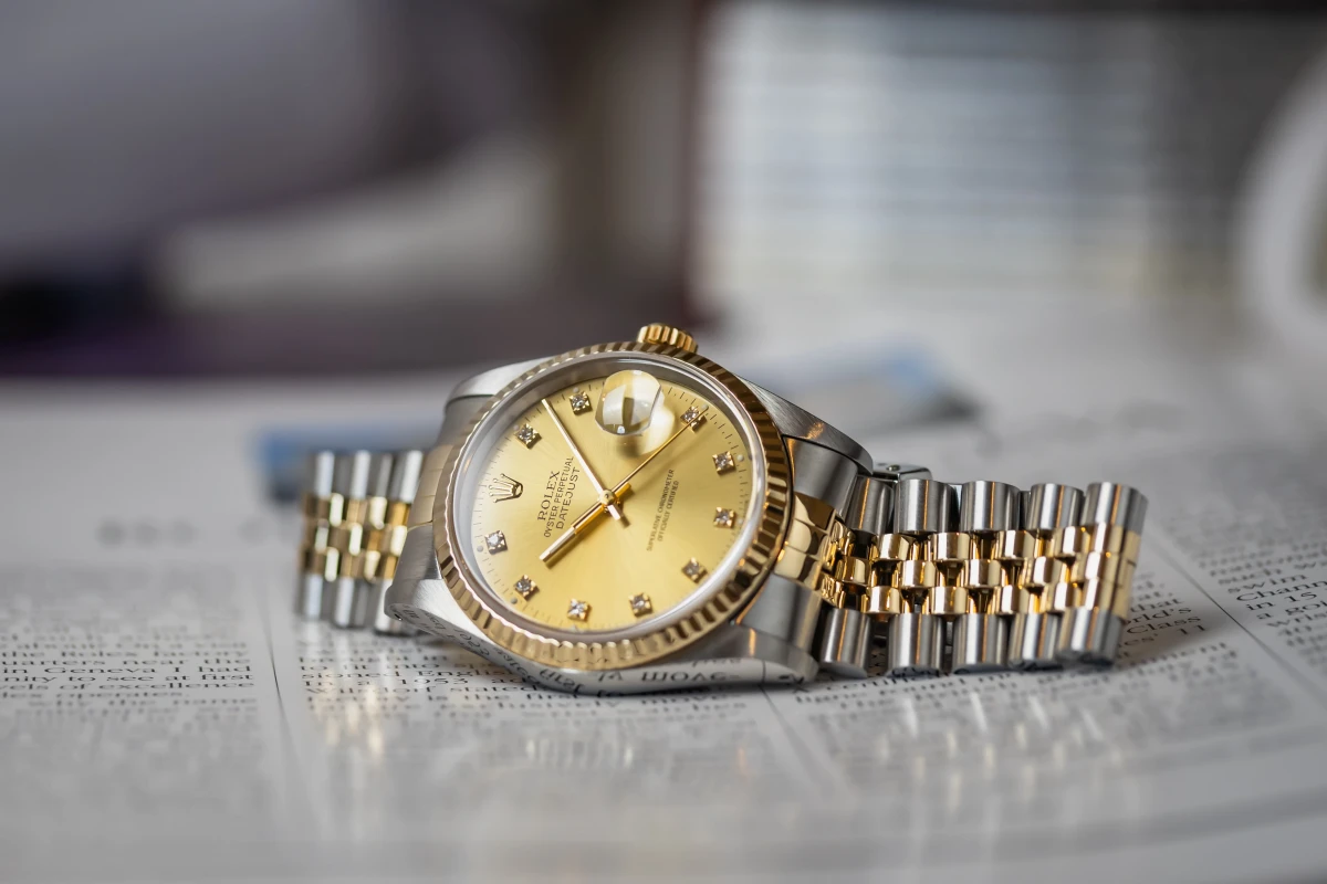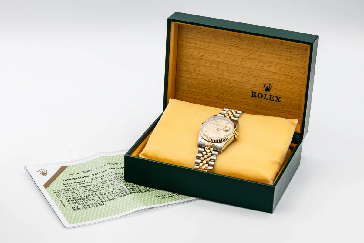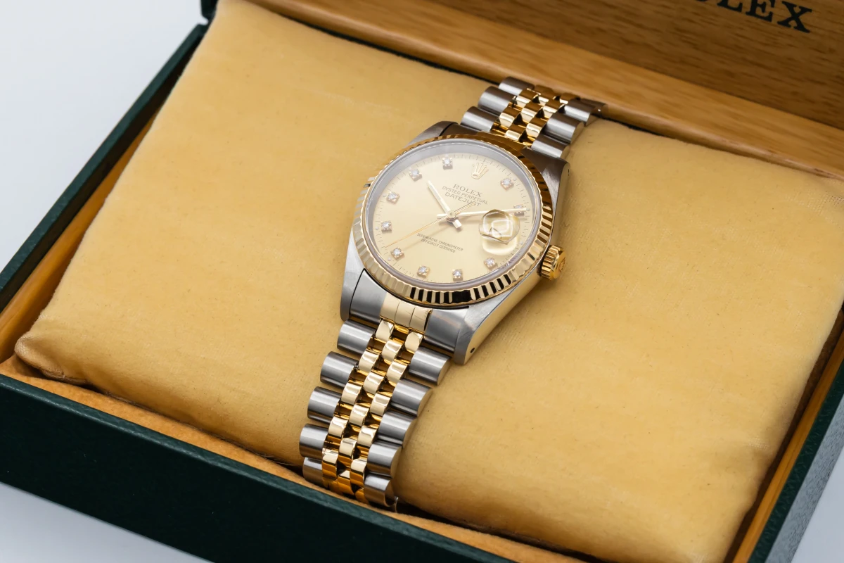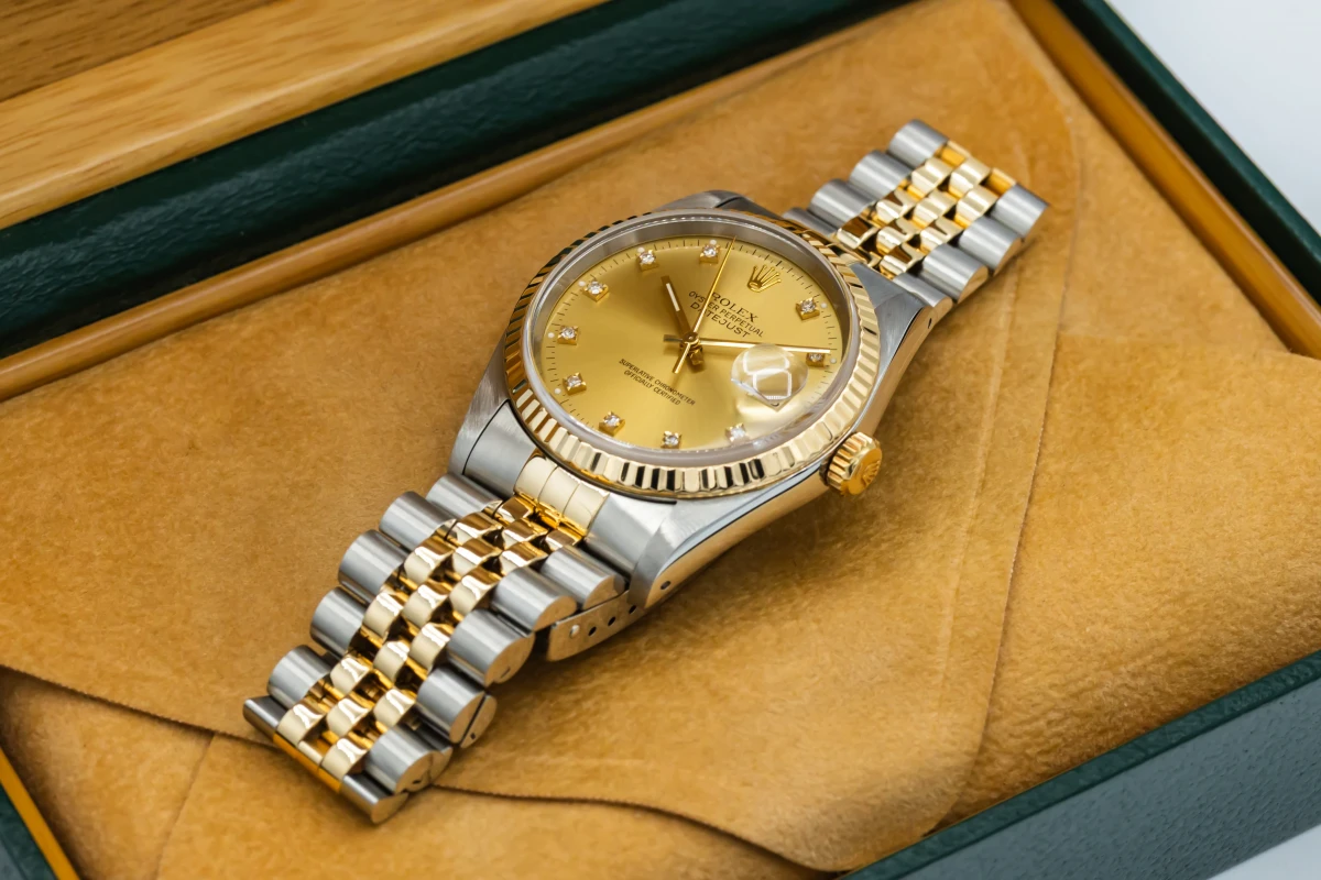 This 1991 Rolex DateJust 36mm features a champage dial with factory diamond markers and a stainless steel and 18ct yellow gold jubilee bracelet. It also features a 18ct yellow gold fluted bezel.