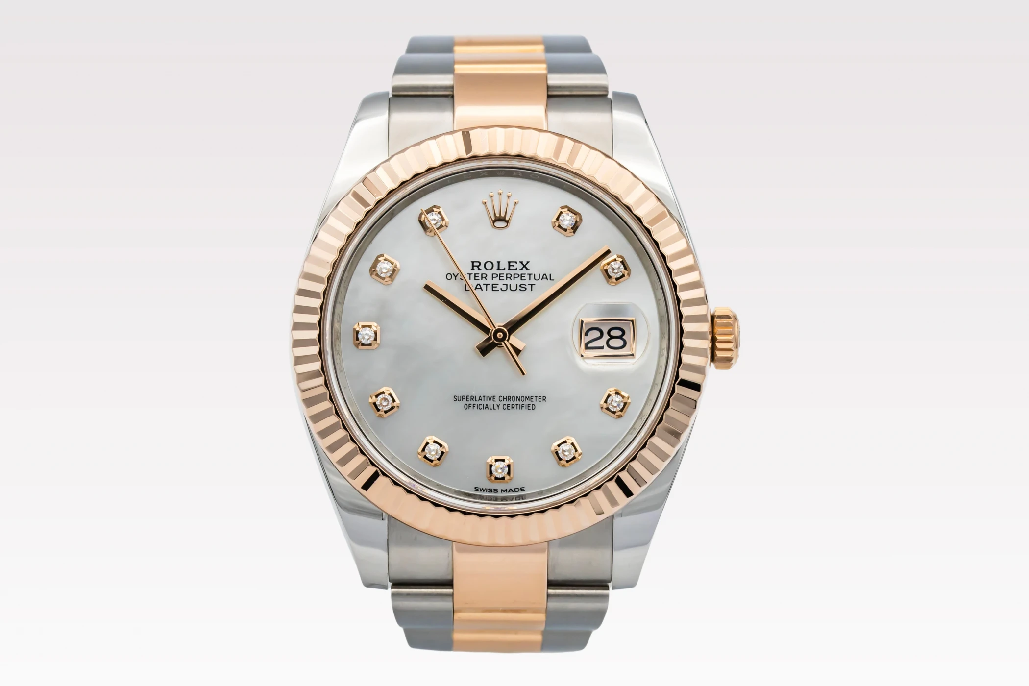 This 2019 Rolex DateJust 41mm features a mother of pearl dial with factory diamond markers and a stainless steel and 18ct rose gold oyster bracelet. It fitted with a 18ct rose gold fluted bezel.