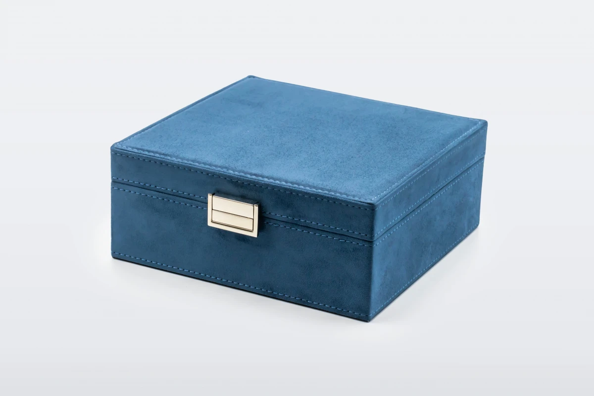 Our travel case is a versatile and stylish option for all your on-the-go storage needs. It is expertly crafted in a sleek navy blue velvet material, providing a luxurious and sophisticated look. The material is soft to the touch and adds a sense of elegance to the case.