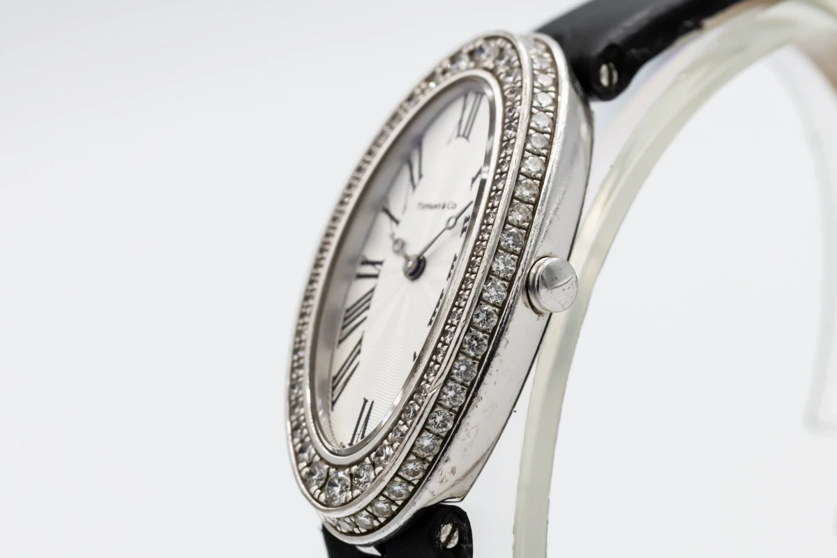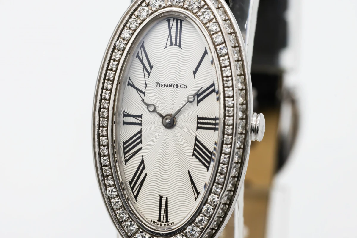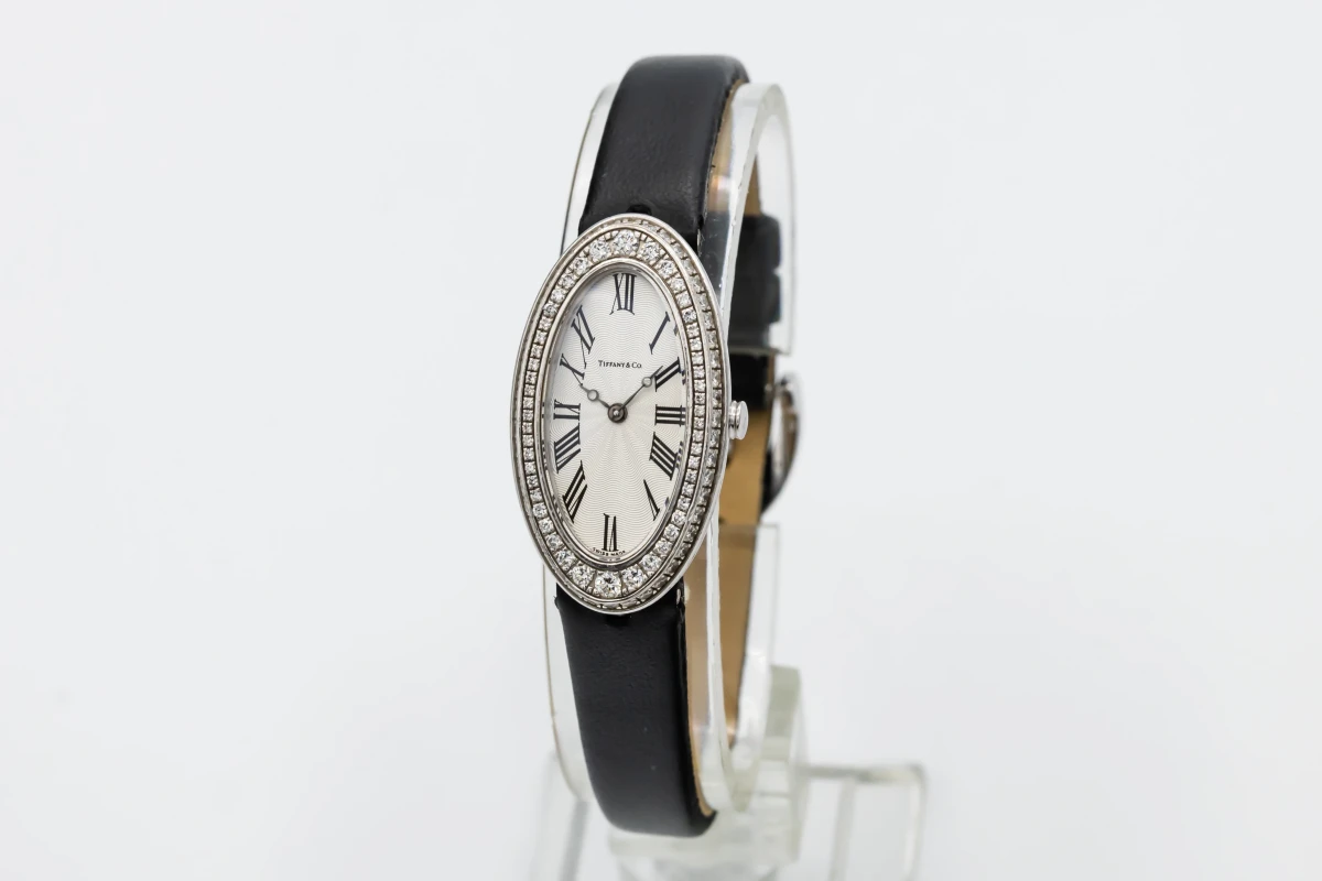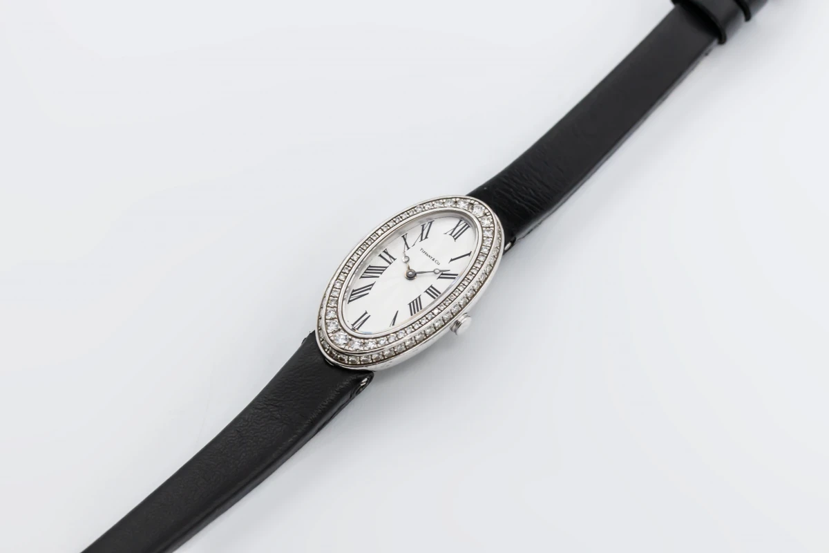 This circa 1990s Tiffany & Co Cocktail watch 25x35mm features a white dial with roman numerals and a black leather bracelet. It also features a factory diamond encrusted 18ct white gold bezel.
