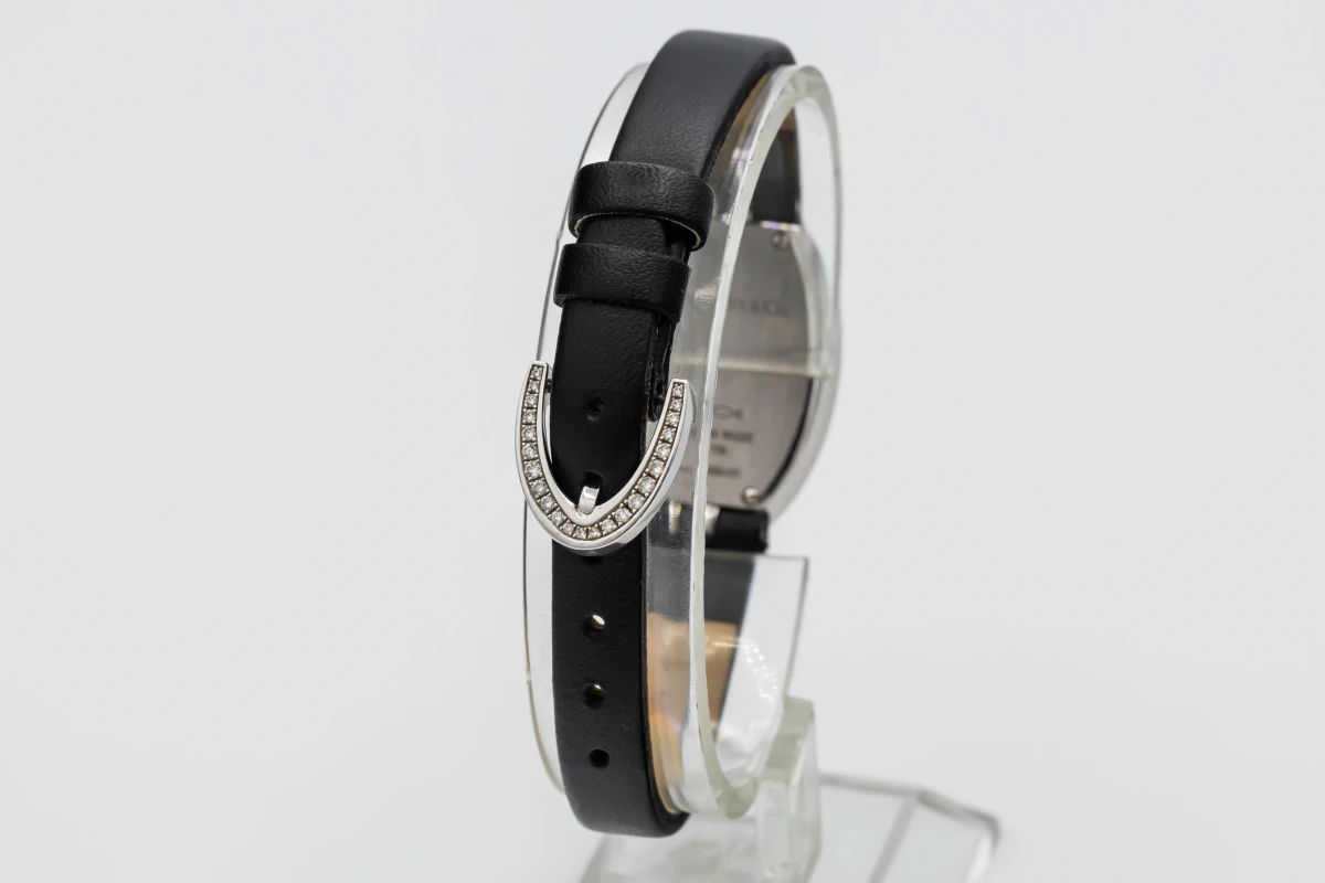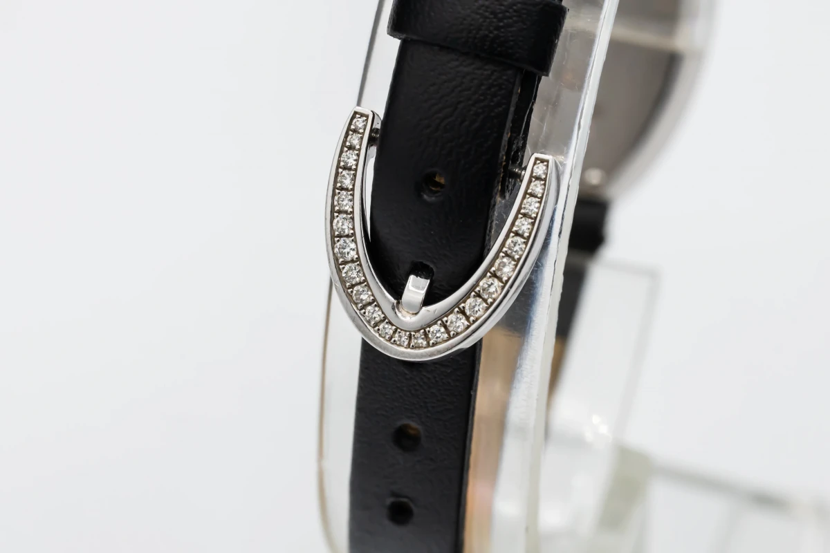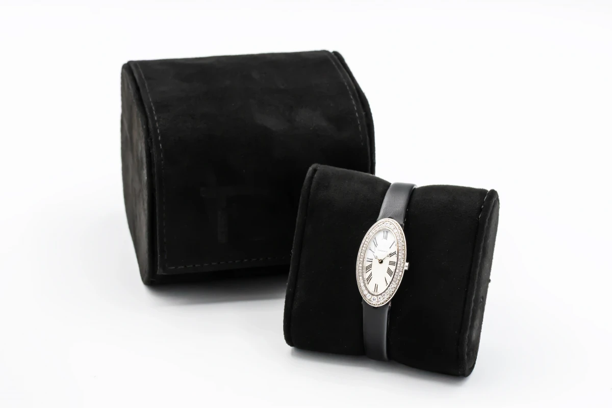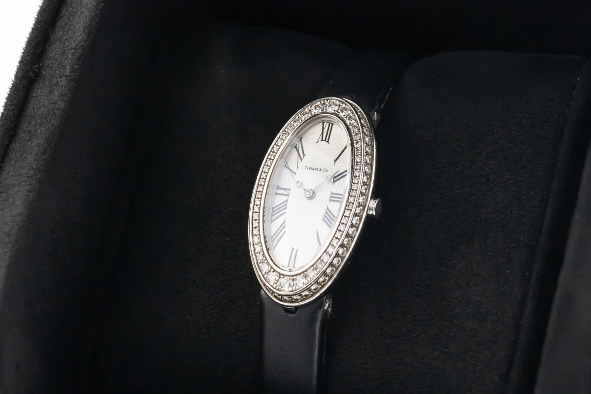 This circa 1990s Tiffany & Co Cocktail watch 25x35mm features a white dial with roman numerals and a black leather bracelet. It also features a factory diamond encrusted 18ct white gold bezel.