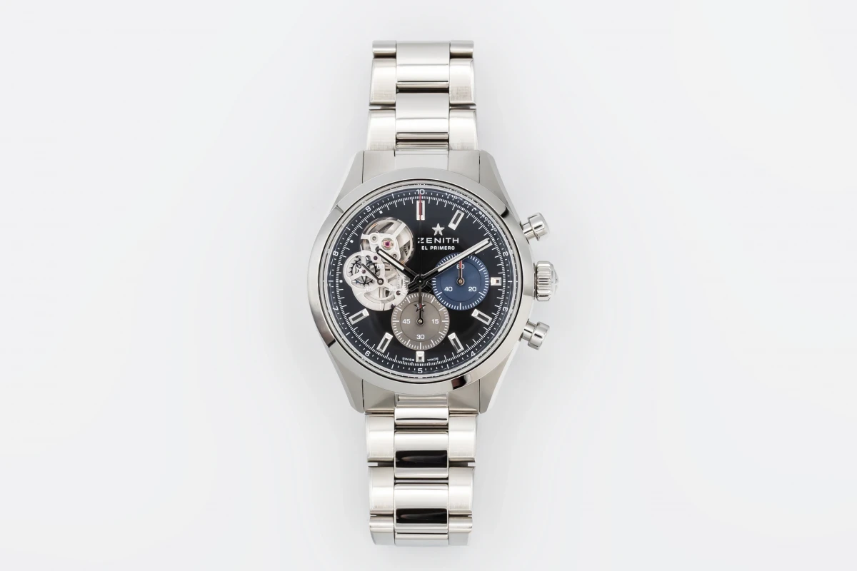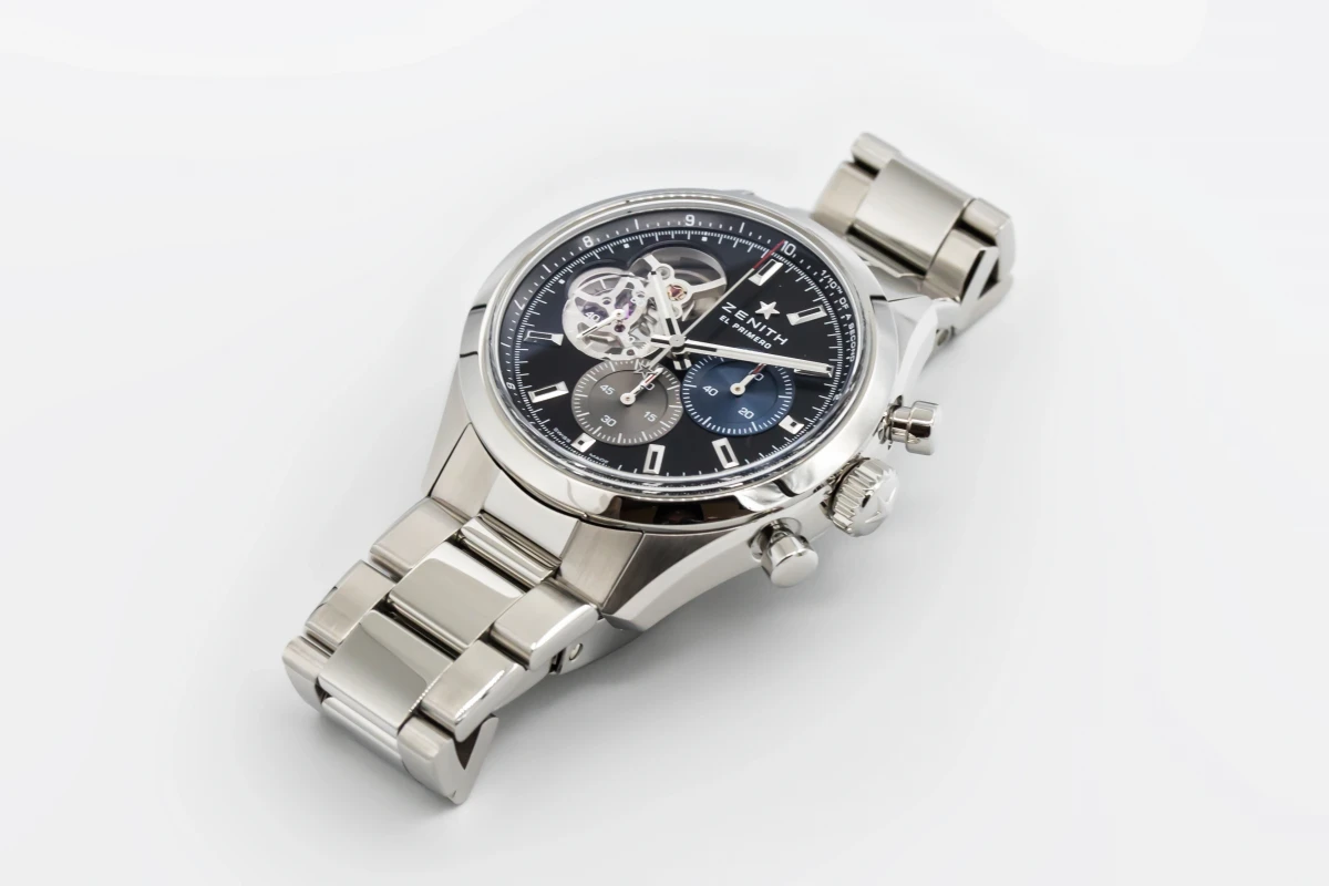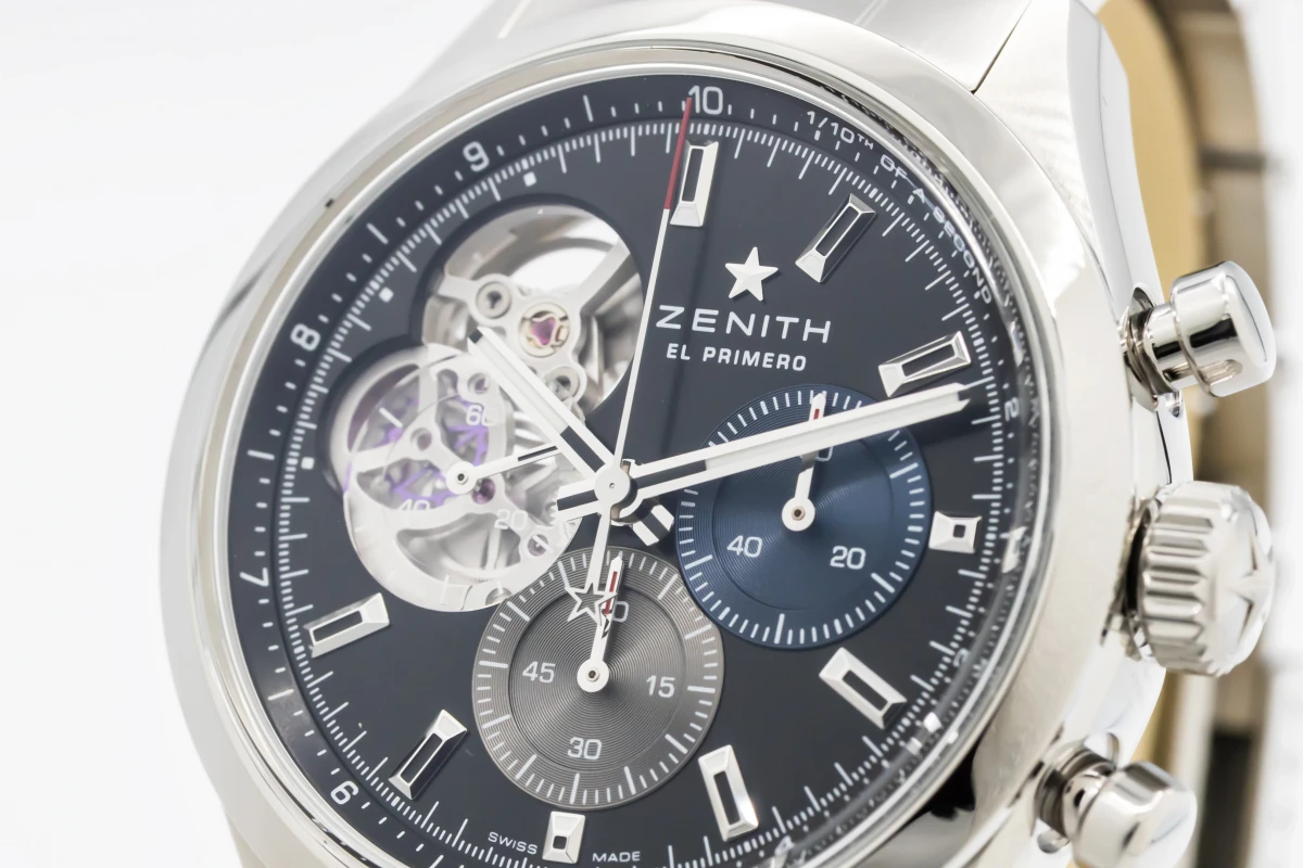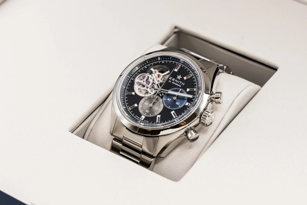 This 2024 Zenith Chronomaster Open Automatic 39.5mm features a black dial with baton markers and a stainless steel bracelet.